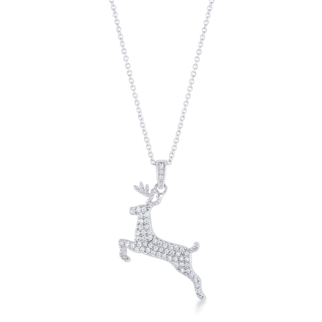 Product Description Clear stones accent a reindeer design in this beautifully classic holiday pendant. A beautifully festive piece for the holiday season!Base Metal: Lead Free Alloy (brass)Style: ContemporarySetting Type: PaveMaterials: Cubic ZirconiaStone Cut: RoundPlating Color: RhodiumChain Clasp: LobsterChain Length: 18" Chain + 2" ExtenderStone Size: 1.15 Mm